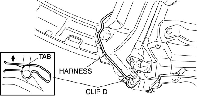 5. Remove clip D while pulling it in the direction shown by the arrow avoiding the tab.
