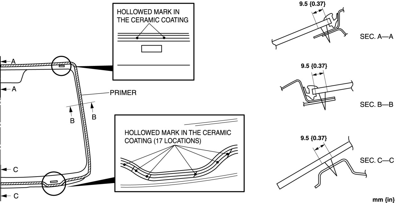 4. Align the marks made before removal and install the pin to the windshield referring to the figure. (when reusing the glass, and the pin was removed)