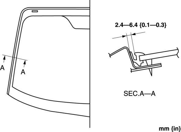 13. Verify that the clearance of the A-pillar is within the range shown in the figure, and press along the perimeter of the glass.