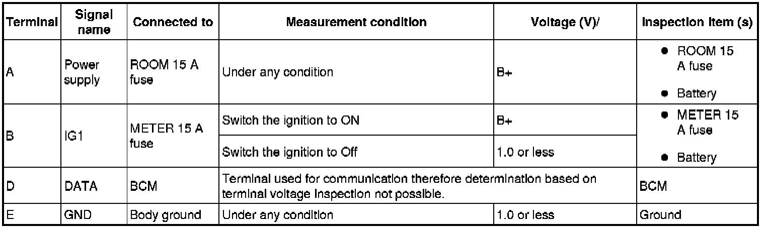 - If the voltages cannot be verified as indicated in the terminal voltage table, inspect the parts under "Inspection item (s)".