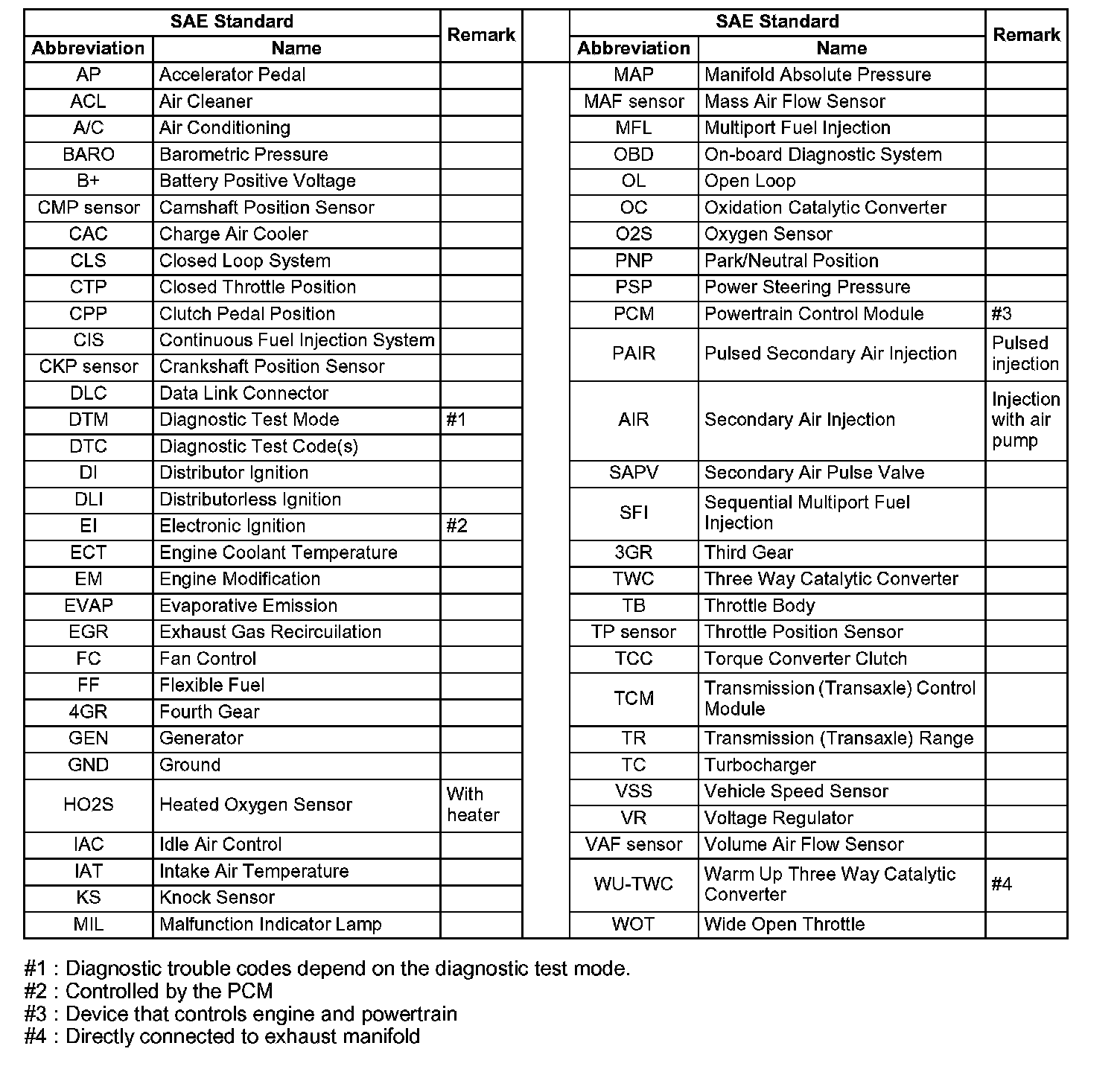 SAE STANDARDS^ In accordance with new regulations, SAE (Society of Automotive Engineers) standard names and abbreviations are now used in this information. The table below lists the names and abbreviations that have been used in Mazda information up to now and their SAE equivalents.