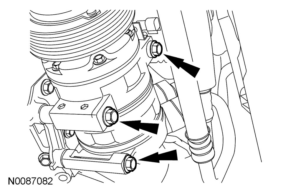 38. Position the A/C compressor and install the 3 bolts.