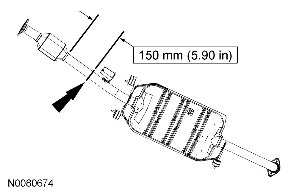 CAUTION:The catalytic converter and muffler assembly is 1-piece construction. The service catalytic converter and muffler is a 2-piece construction. It is necessary to cut the production exhaust to enable the service section to be fitted. Before cutting any part of the exhaust system, check that the position of the cut is correct in comparison to the service section being installed.