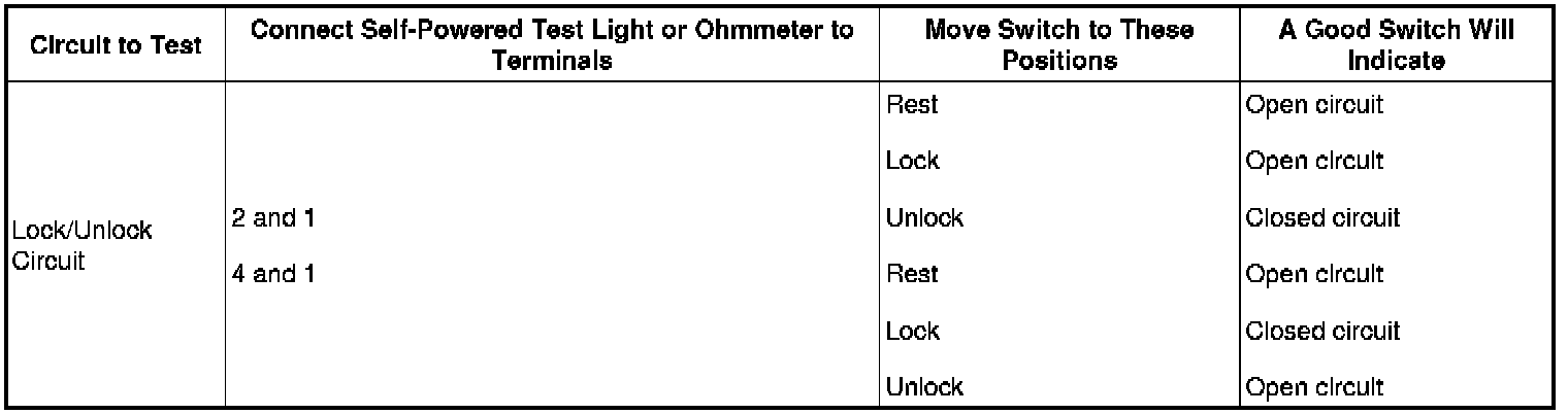 2. Inspect for continuity between the door lock control switch terminals using a self-powered test light or an ohmmeter.