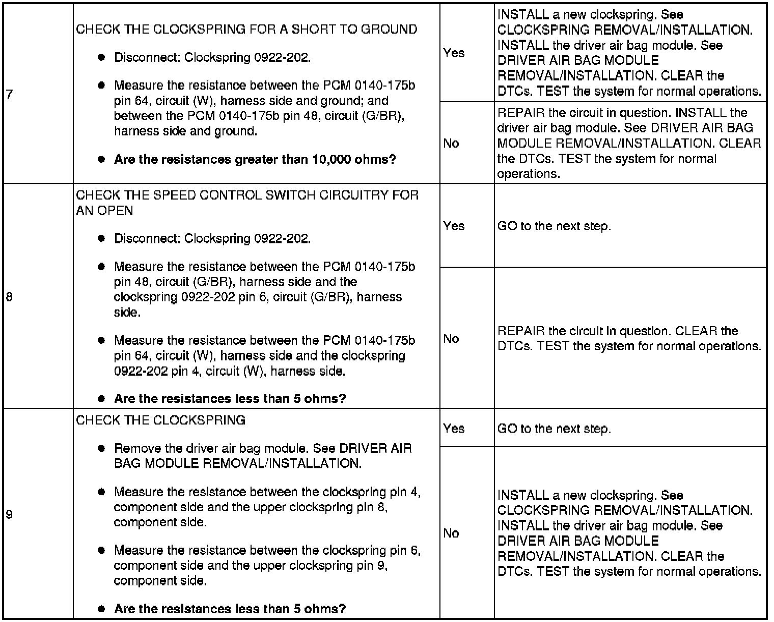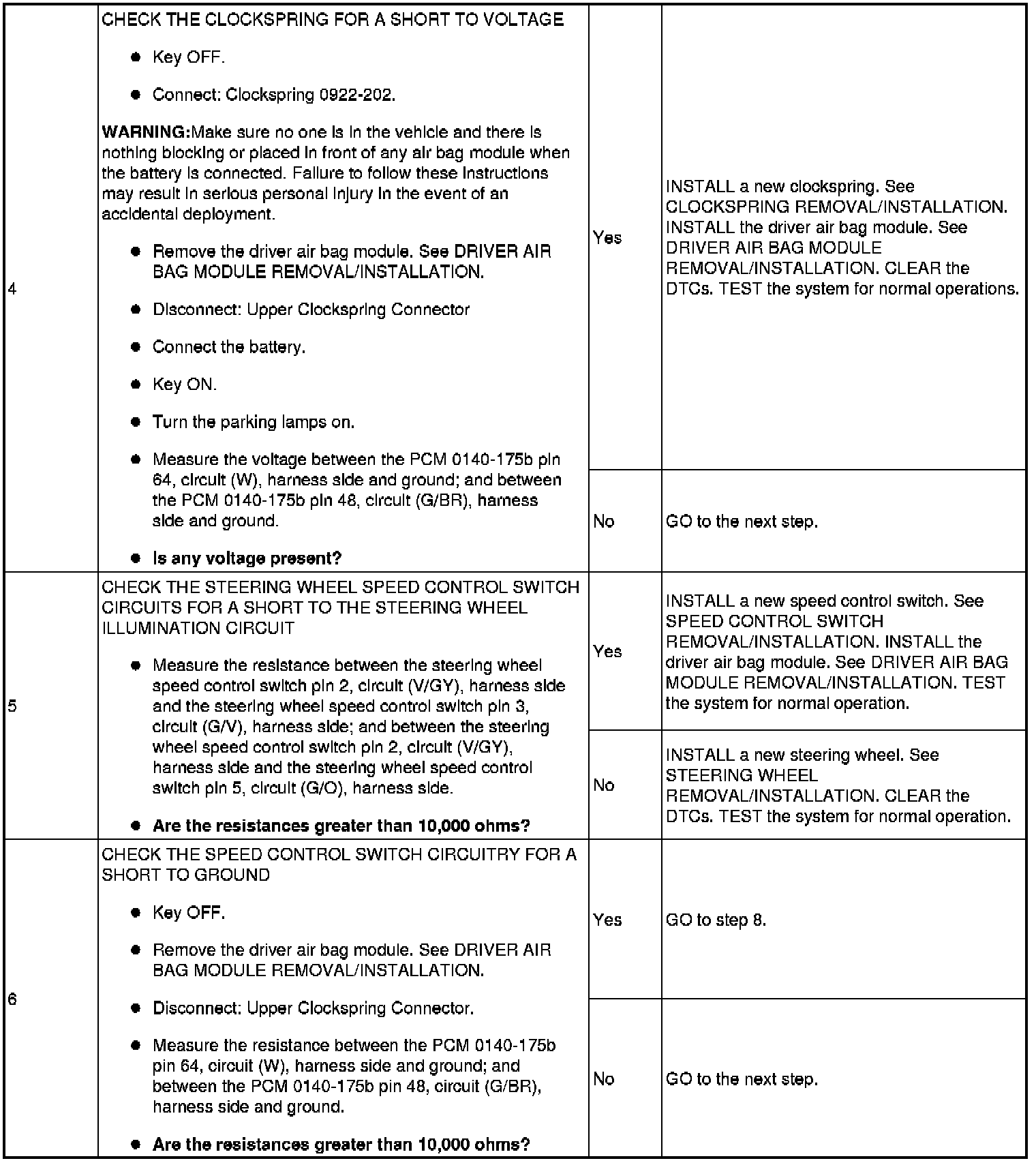 Voltage is sent from the PCM to the speed control switches through circuit (W). When a switch is pressed, the voltage is routed through a specific resistor value for each function. The PCM grounds the reference voltage through circuit (G/BR). The PCM uses this reference voltage to determine which speed control input function has been selected.