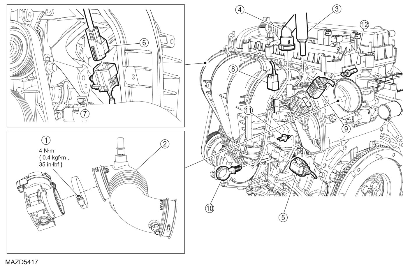 - To install, tighten to 4 Nm {0.4 kgf-m, 35 in-lbf}.