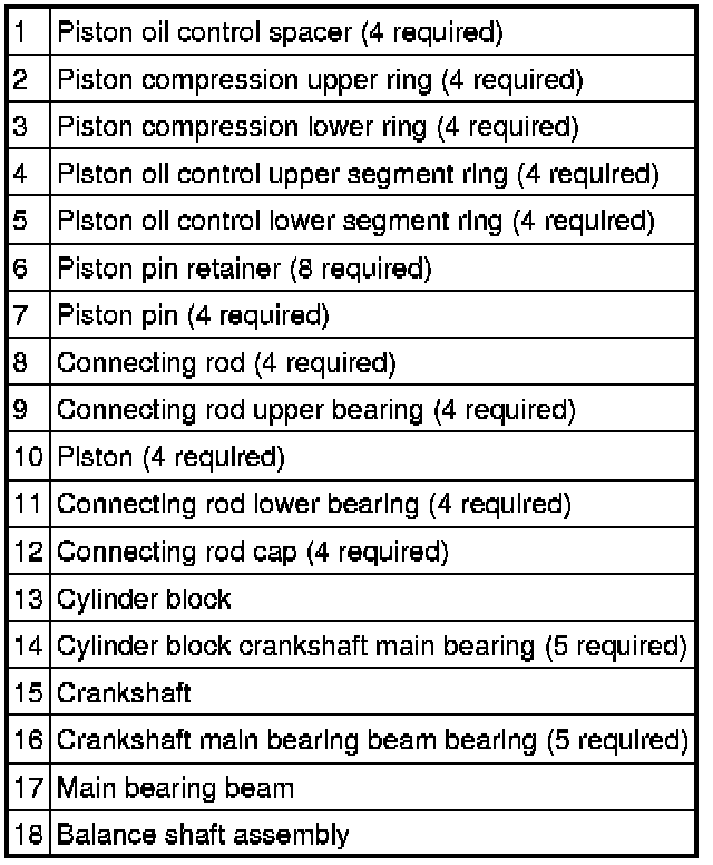 NOTE:Assembly of the engine requires various inspections/measurements of the engine components (engine block, crankshaft, connecting rods, pistons and piston rings). These inspections/measurements will aid in determining if the engine components will require replacement. See Specifications.