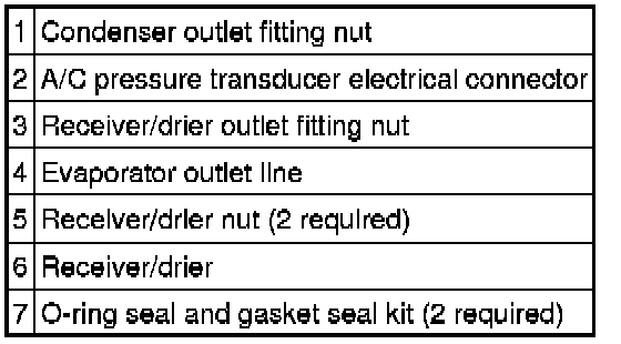 NOTE:Installation of a new receiver/drier is not required when repairing the A/C system, except when there is physical evidence of contamination from a failed A/C compressor or damage to the receiver/drier. Damage to the receiver/drier includes leaks, physical damage to the receiver/drier shell or desiccant, or moisture contamination. Moisture contamination results only from a complete loss of refrigerant, and equalization of the refrigerant system pressure with atmospheric pressure for a period longer than one hour. If even a slight amount of positive refrigerant pressure is present in the refrigerant system before repairs are carried out, a new receiver/drier should not be installed.