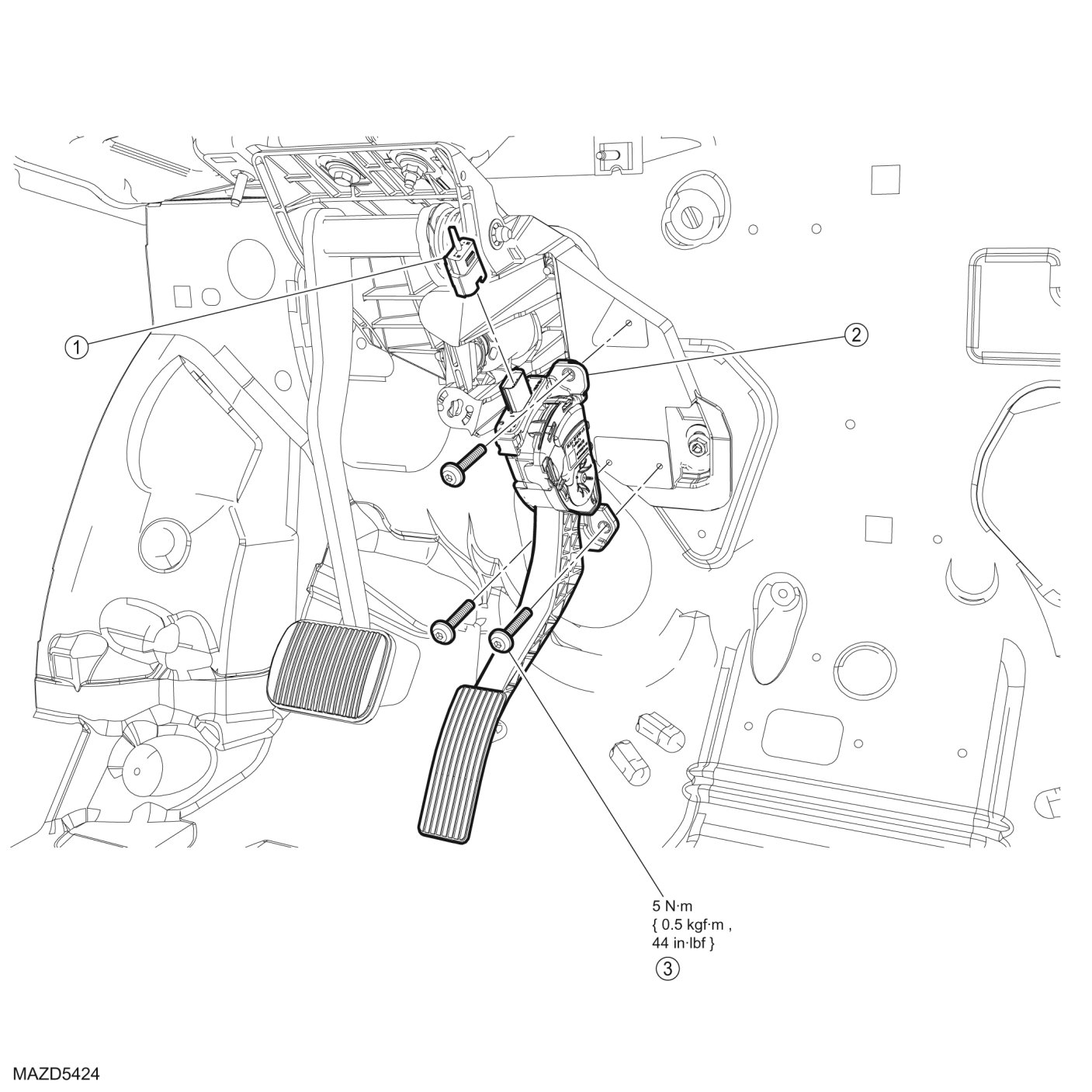 2. Remove the 3 self-tapping screws and the accelerator pedal and sensor assembly.