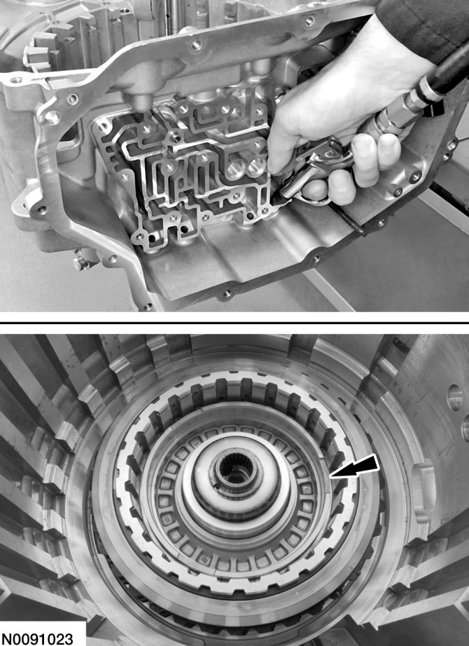 29. Position the O/D/direct clutch assembly in the transaxle case, install Dial Indicator Gauge With Holding Fixture or a suitable dial indicator and position the plunger on the O/D (4, 5, 6) clutch pressure plate. Apply 483 kPa (70 psi) of air pressure to the O/D (4, 5, 6) clutch piston port while recording the clutch pack clearance on the Dial Indicator. The clearance should be between 0.950 mm (0.037 in) and 1.778 mm (0.07 in). If the clearance is out of range, check the O/D (4, 5, 6) clutch pack for correct installation. If the O/D (4, 5, 6) clutch pack is correctly installed, install a new O/D (4, 5, 6) clutch pack.