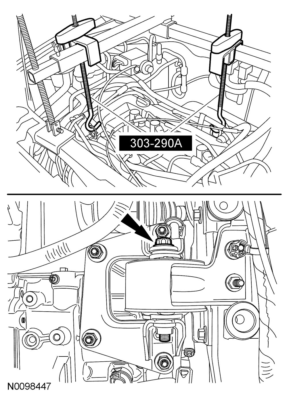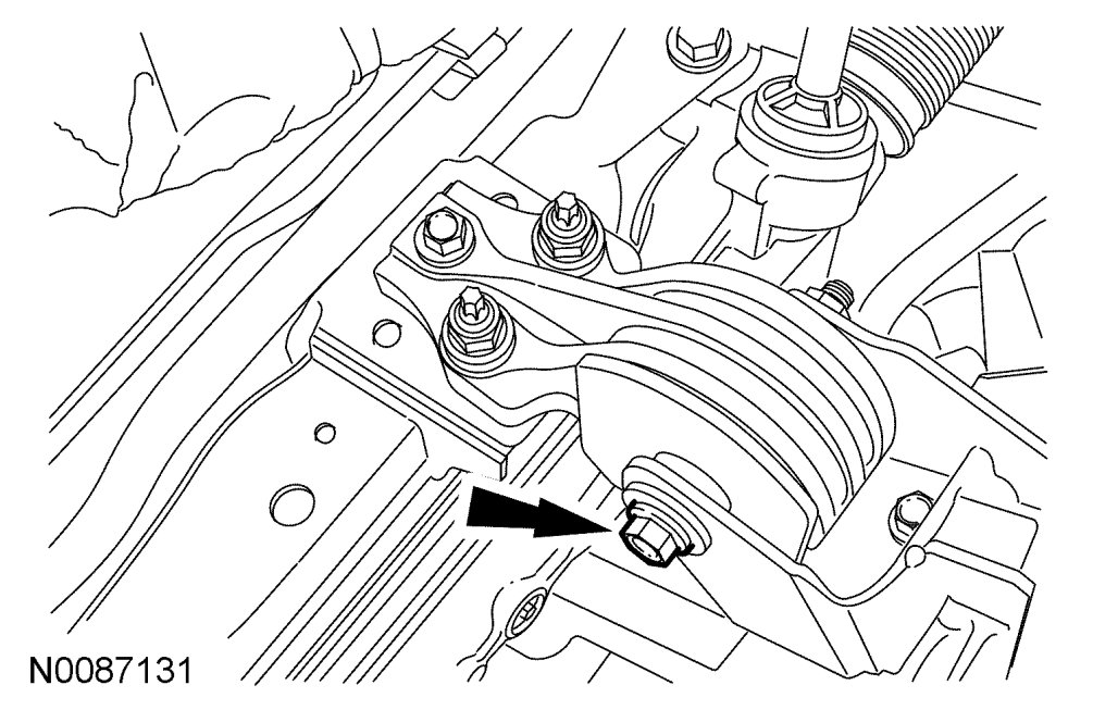 5. Using the Engine Support Bar and Adapters, raise the transaxle until the transaxle support insulator bracket lines up with the transaxle support insulator and install the through bolt.