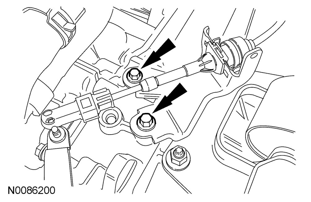 7. Position the selector lever cable and bracket in place and install the 2 retaining bolts.