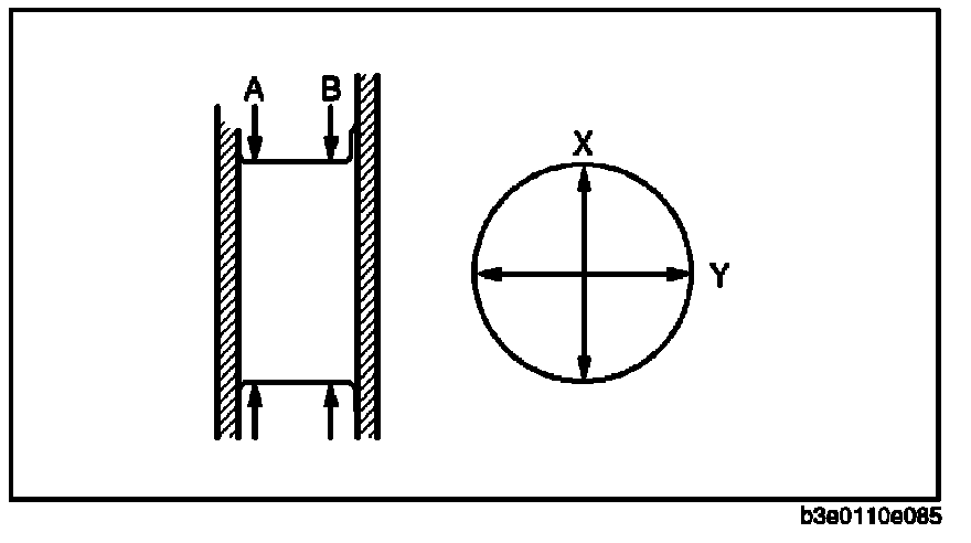 3. Inspect the main journal diameter and crank pin diameter. Measurement positions total four and they are in the X and Y directions, at two points (A and B) as shown in the figure.