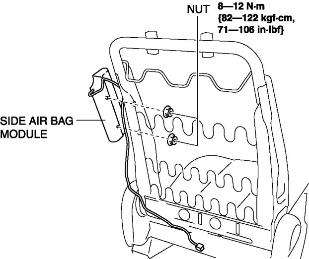- If the side air bag module is installed with debris in the seat back, the foreign material may be scattered when the side air bag module operates (deploys), causing injury. Verify that there is no foreign material in the seat back before installing the side air bag module.