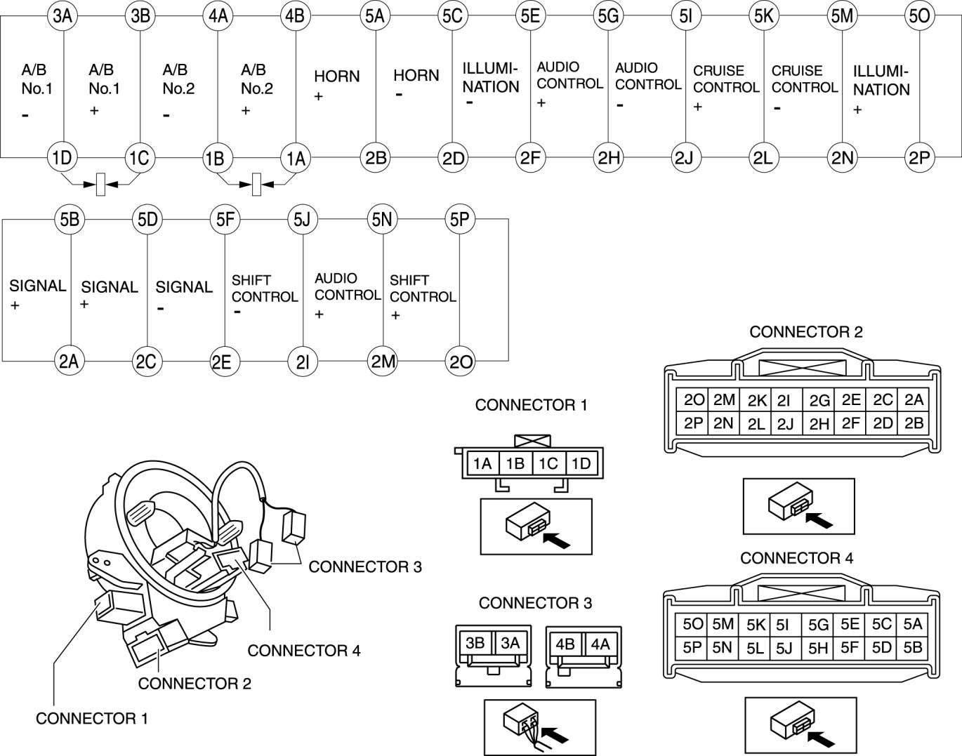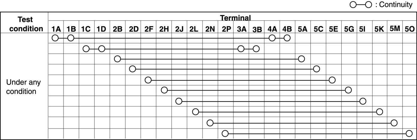 - When the vehicle-side connector for the clock spring is disconnected, terminals 1A, 1B, 1C and 1D are shorted to prevent unexpected operation (deployment) of the air bag module.