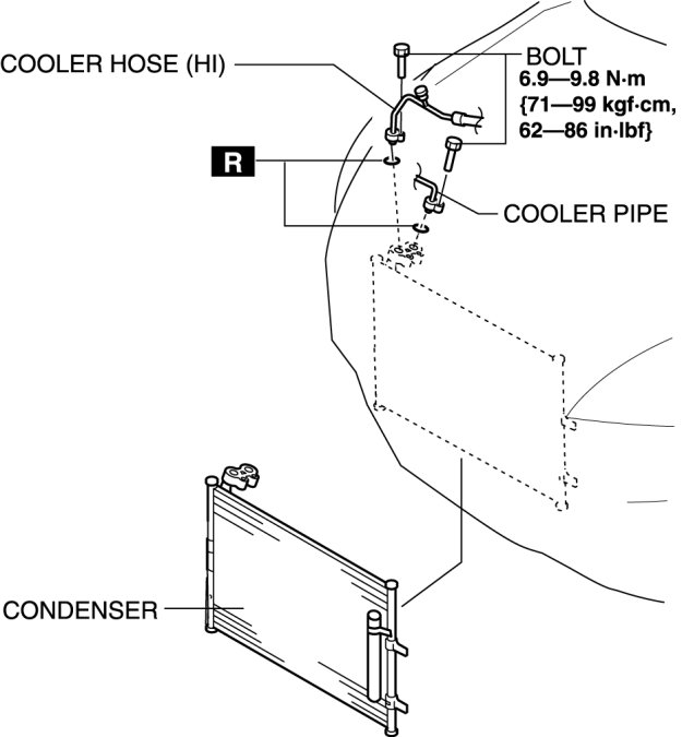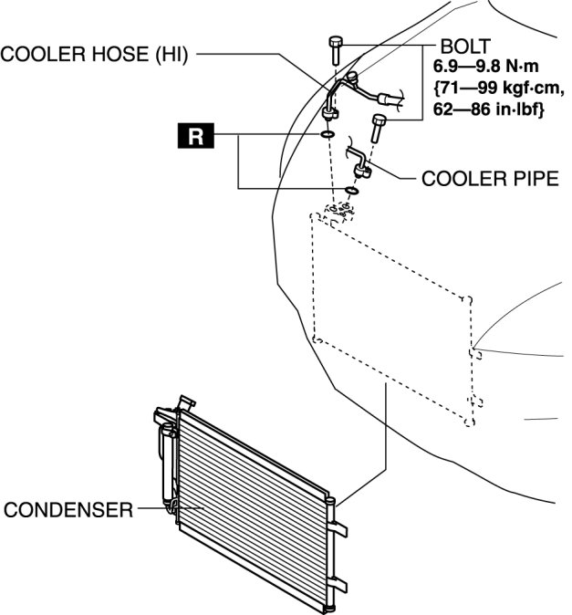 10. Disconnect the cooler hose (HI) and cooler pipe. Do not allow remaining compressor oil in the refrigerant line to spill. Service and Repair