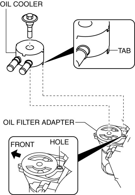 1. Align one of the positioning tabs on the oil cooler as shown in the figure to the oil filter adapter hole, and install the oil cooler.