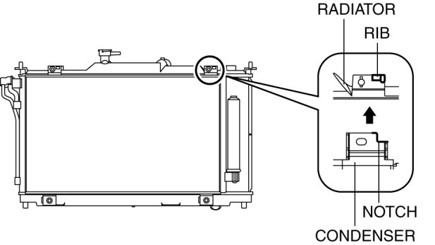 2. Align the bracket notch of the condenser to the radiator positioning rib.