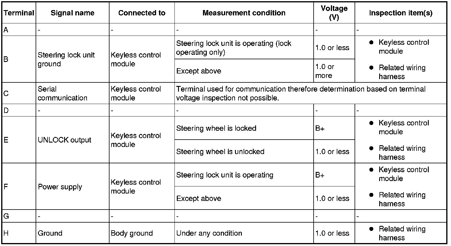 - If the voltage is not as specified in the terminal voltage table, inspect the parts under "Inspection item(s)".