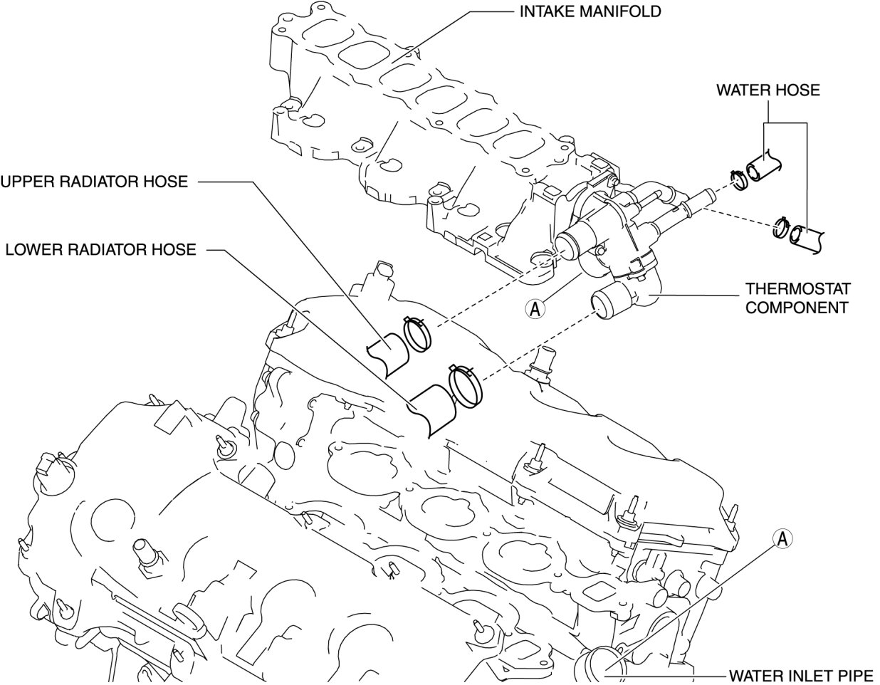 6. Disconnect the thermostat component side of the water inlet pipe which is under the intake manifold.