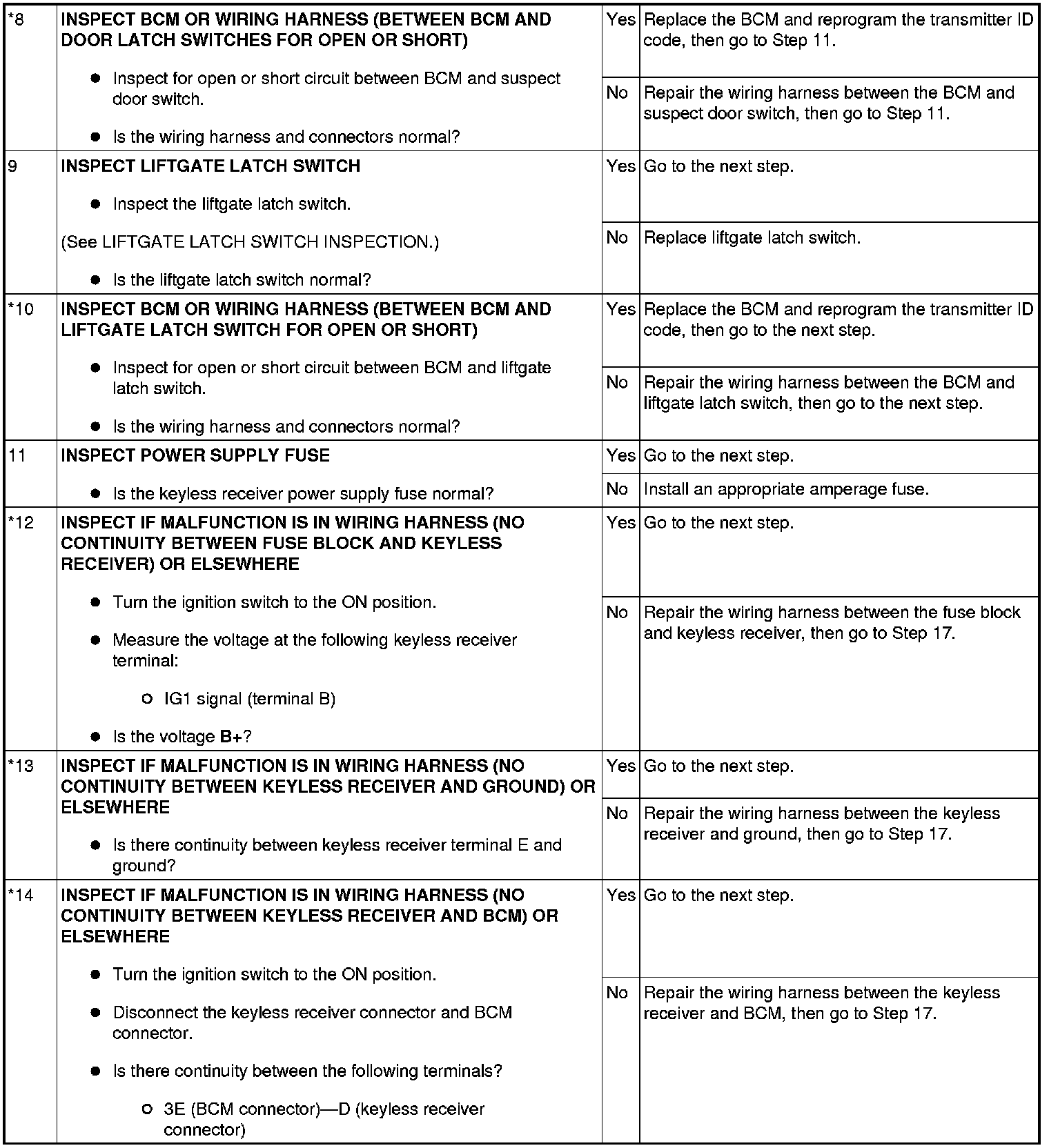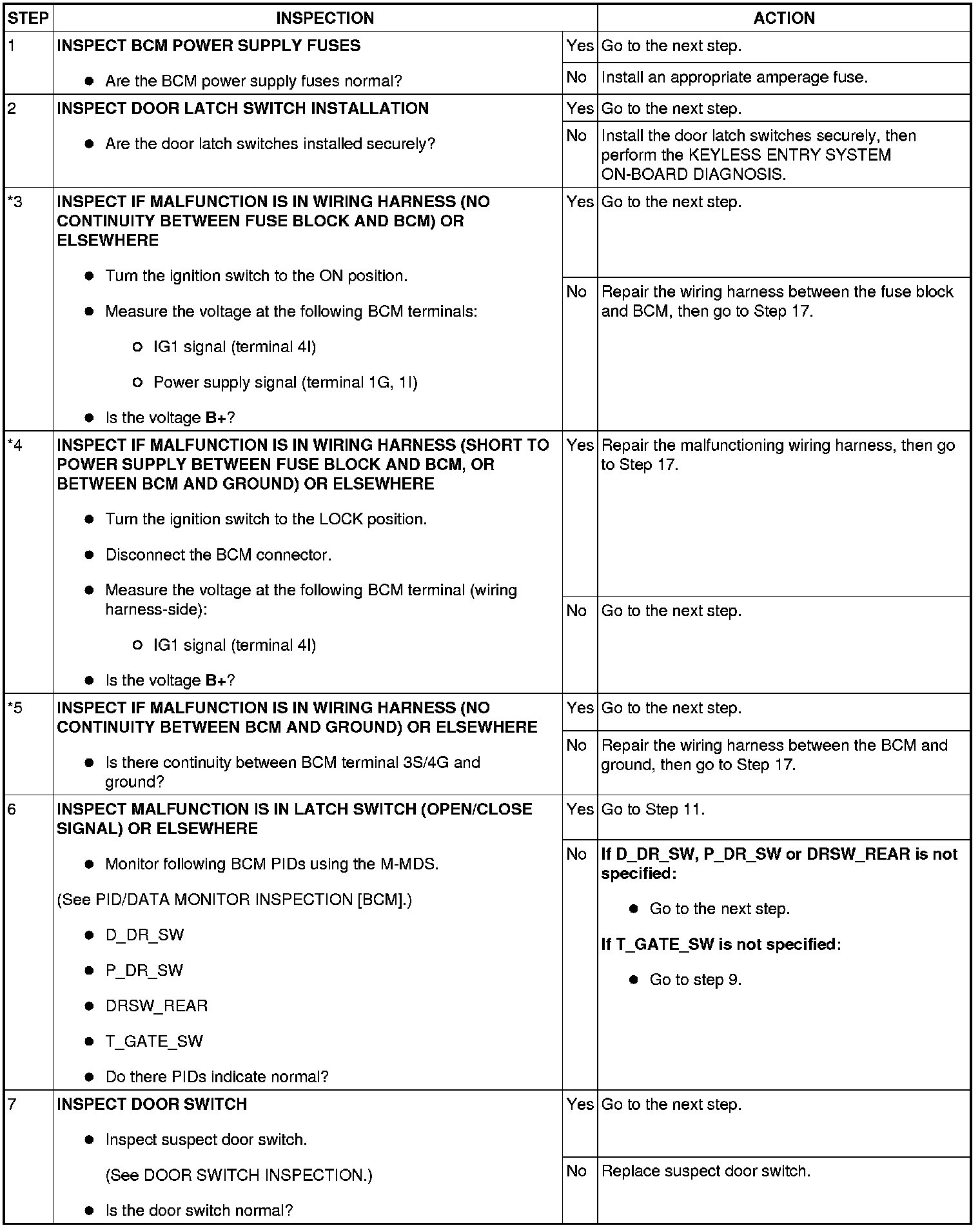 - When performing an asterisked (*) troubleshooting inspection, slightly shake the wiring harness and connectors while performing the inspection to discover whether poor contact points are the cause of any intermittent malfunctions. If there is a problem, verify that the connectors, terminals and wiring harnesses are connected correctly and undamaged.