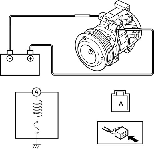 1. Connect battery positive voltage to terminal A of magnetic clutch and ground to A/C compressor body.