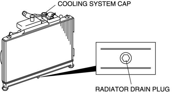 - Never remove the cooling system cap or loosen the radiator drain plug while the engine is running, or when the engine and radiator are hot. Scalding engine coolant and steam may shoot out and cause serious injury. It may also damage the engine and cooling system.