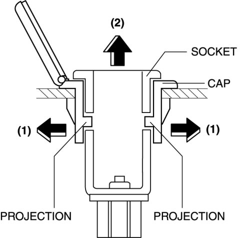 1. Remove the socket in the direction of the arrow (2) shown in the figure while opening the caps in the direction of the arrow (1) using a tape-wrapped fastener remover.