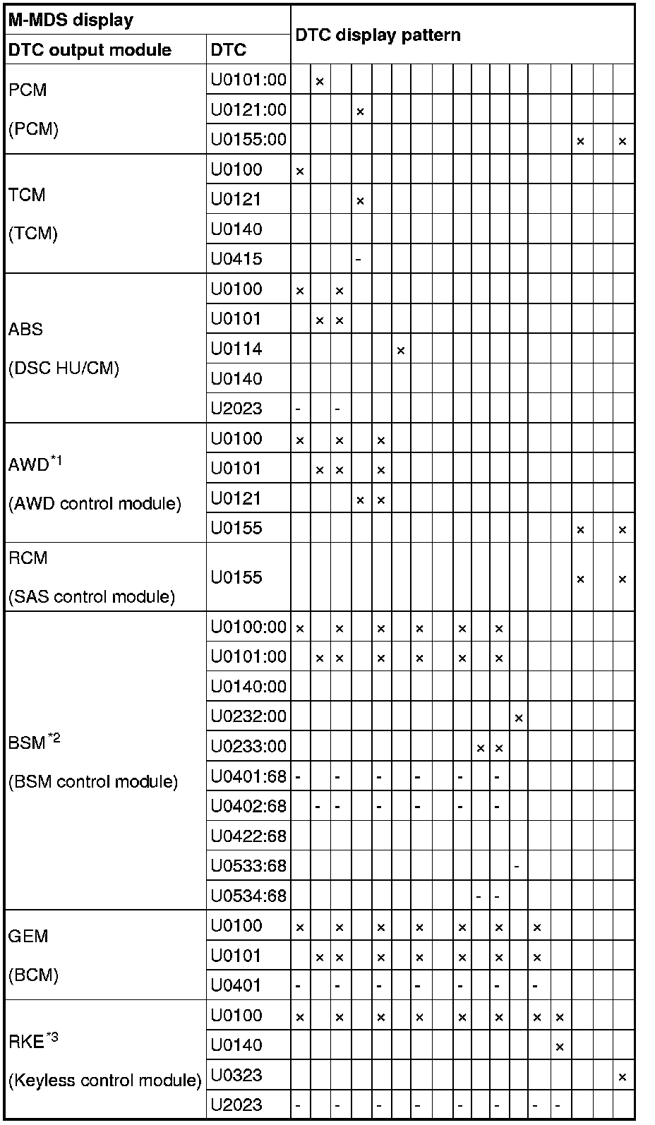 - A hyphen " - " in the DTC output pattern table indicates that the DTC may be displayed depending on the malfunction detection conditions. If only an " x " is indicated, it means the DTC will not be displayed.