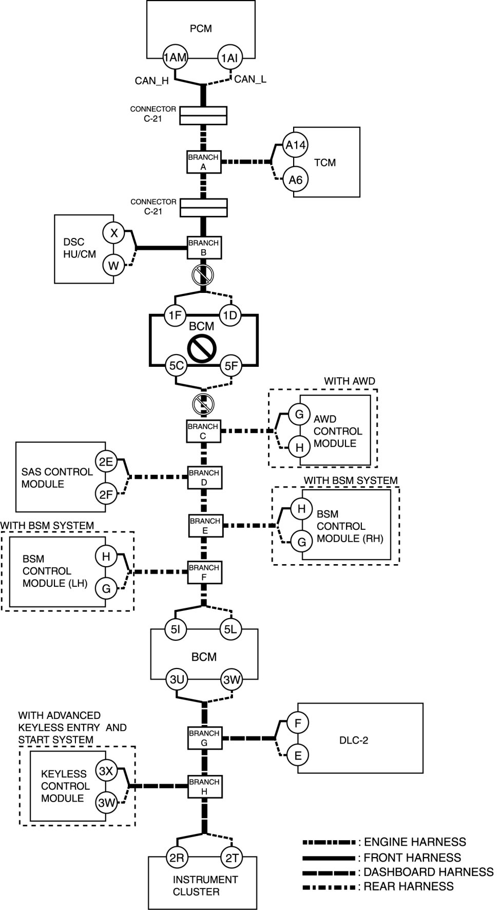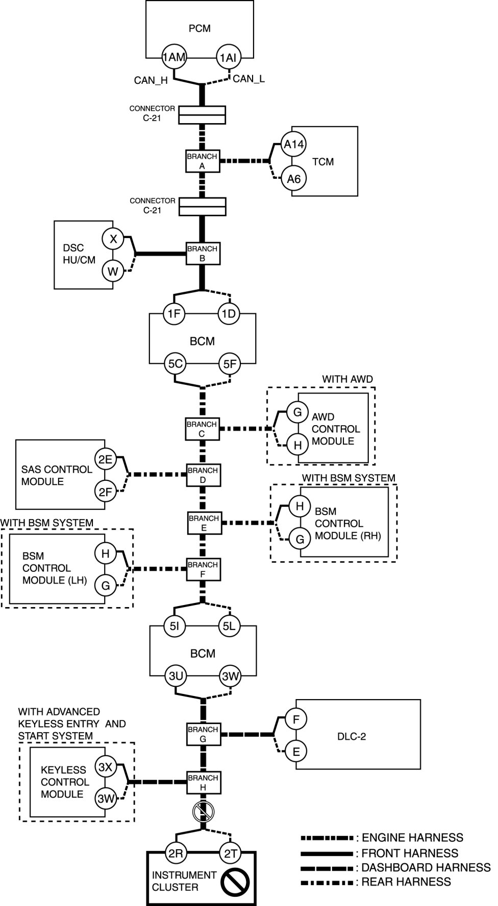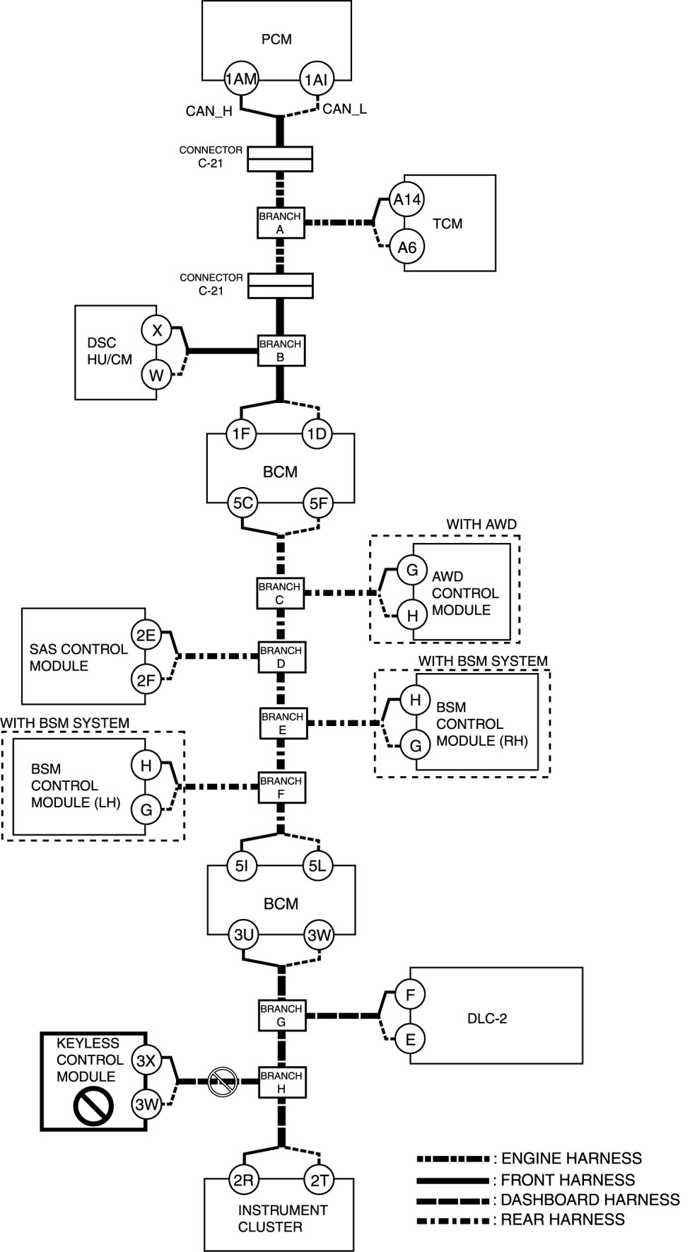 - Wiring harness between DSC HU/CM terminal W and branch B