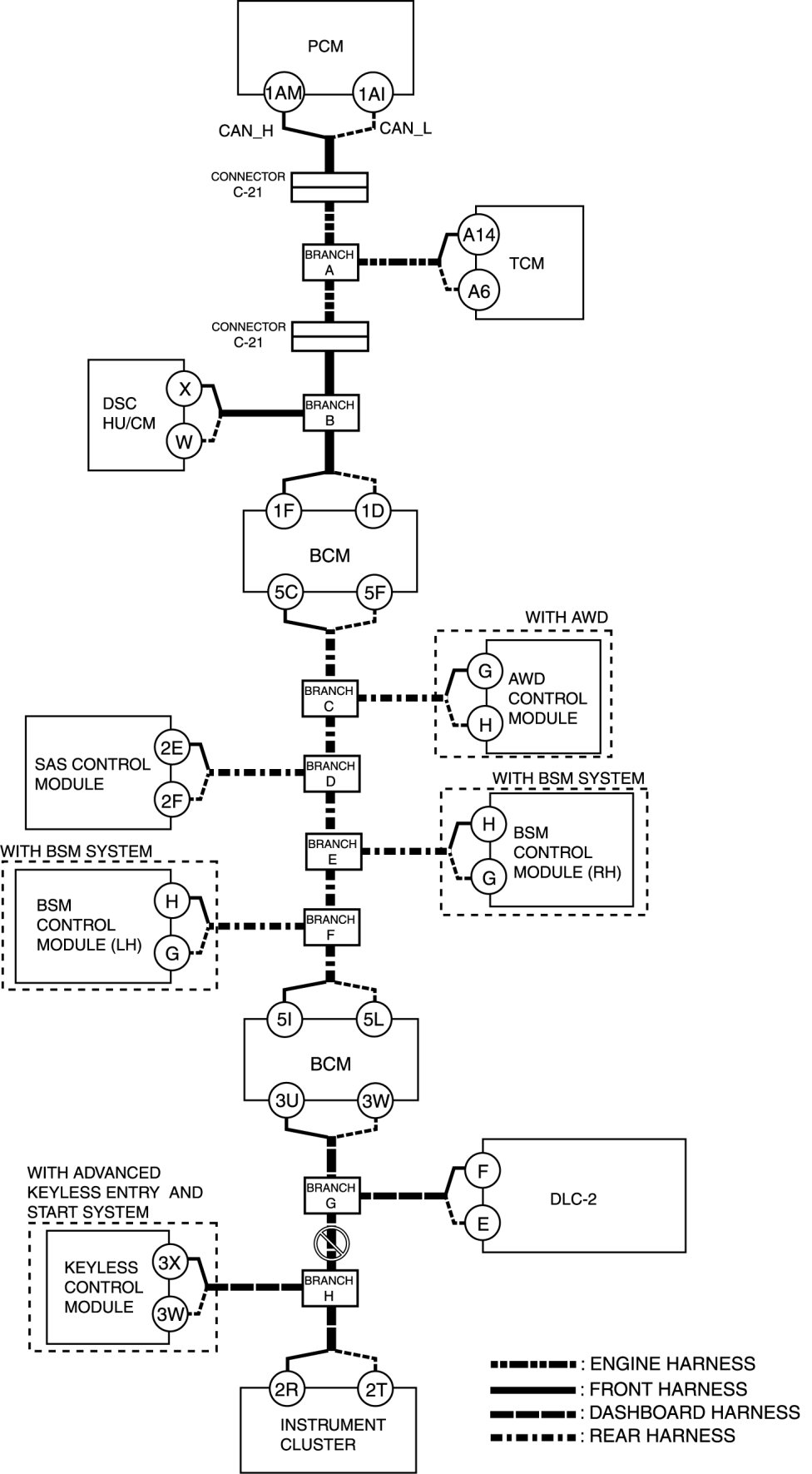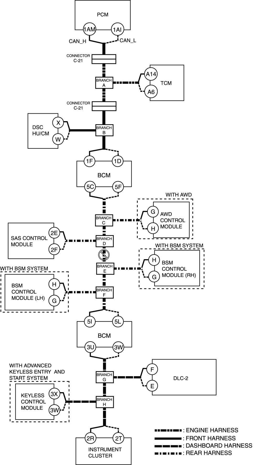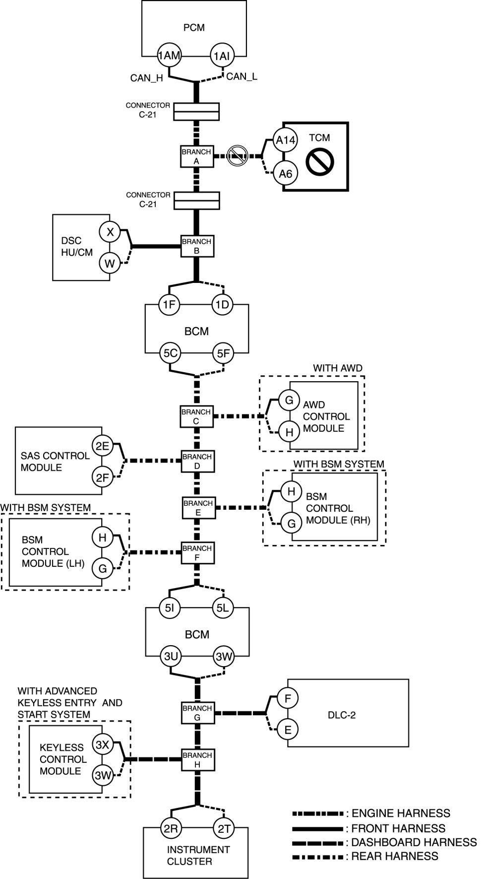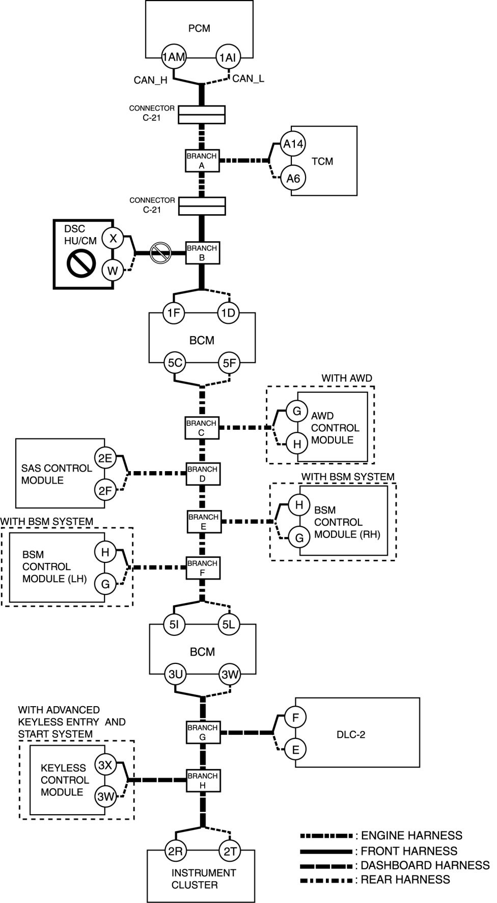 - Wiring harness between DSC HU/CM terminal W and branch B