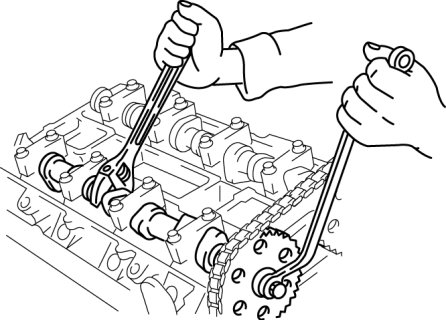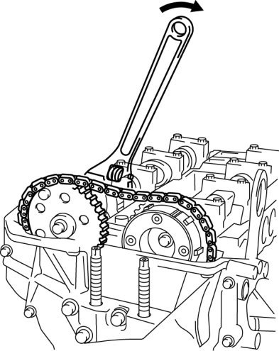 d. Using the cast hexagon on the exhaust camshaft, apply force in the direction of the engine rotation to increase tension on the chain.