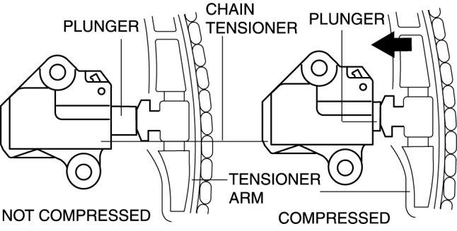 - The chain tensioner rack is compressed using the chain tension generated by applying force to the exhaust camshaft in the direction of the engine rotation.