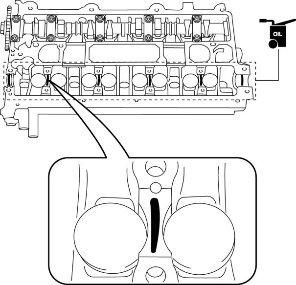 24. Apply the gear oil (SAE No. 90 or equivalent) to each journal of the cylinder head as shown in the figure.