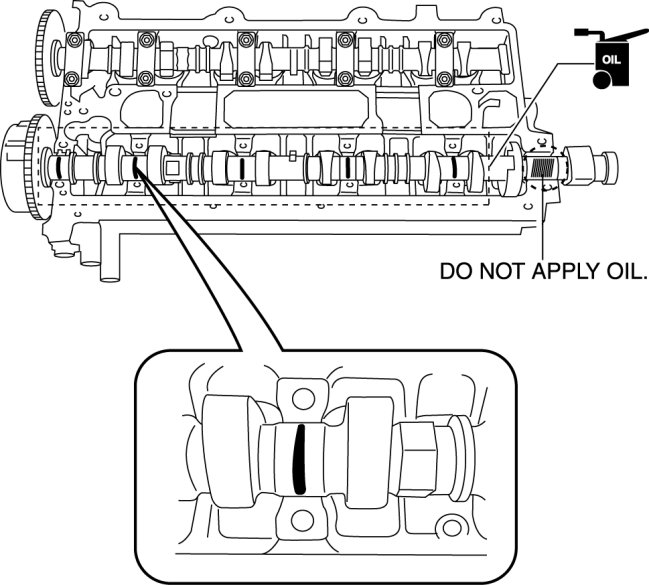 26. Apply the gear oil (SAE No. 90 or equivalent) to each journal of the camshaft as shown in the figure. However, do not apply it to the end journal of the intake camshaft.
