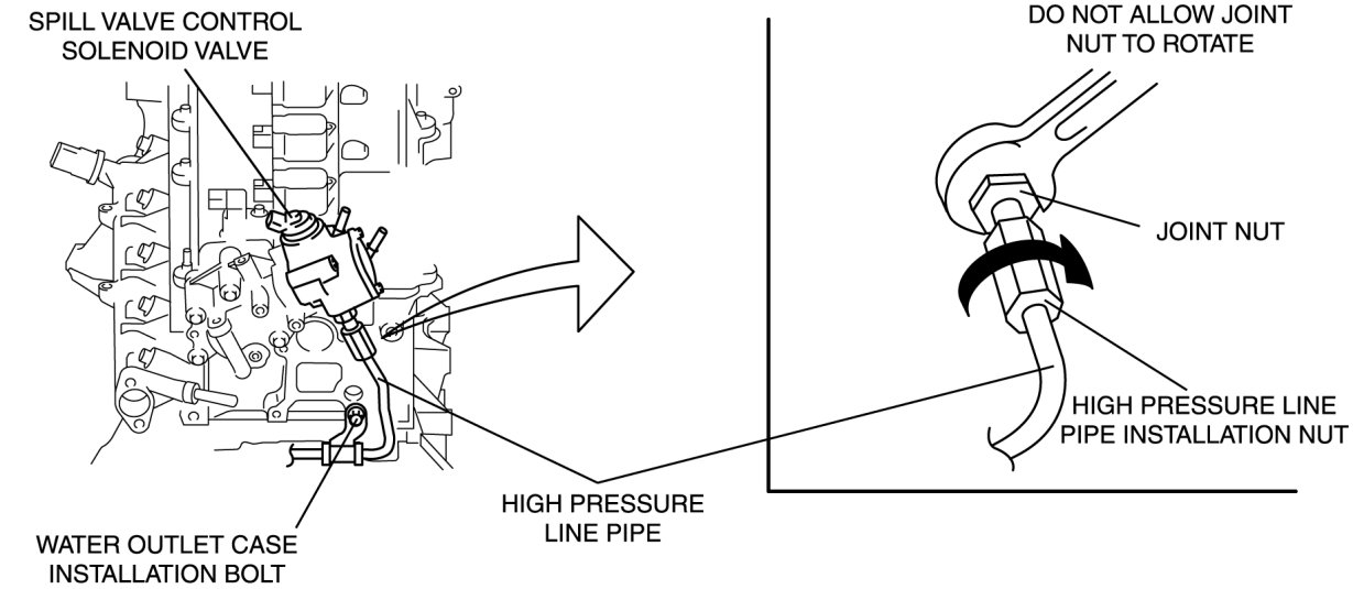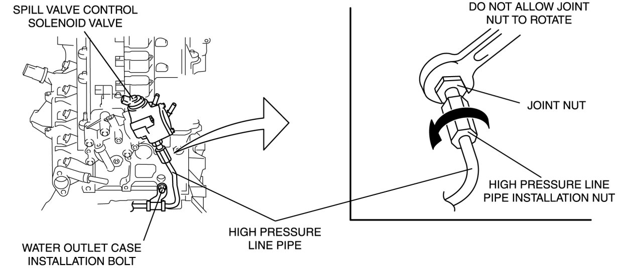 a. Fix the joint nut with a wrench on the high pressure fuel pump side as shown in the figure.