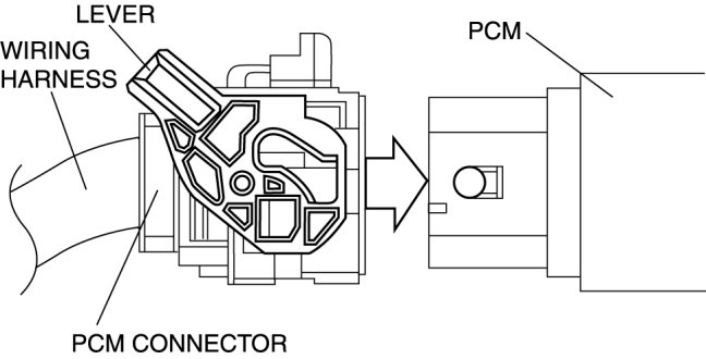 1. Verify that the PCM connector lever is tilted towards the wiring harness side as shown in the figure.
