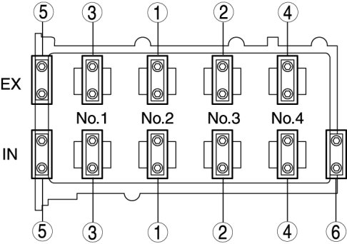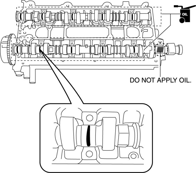 25. Apply the gear oil (SAE No. 90 or equivalent) to each journal of the camshaft as shown in the figure. However, do not apply it to the end journal of the intake camshaft.