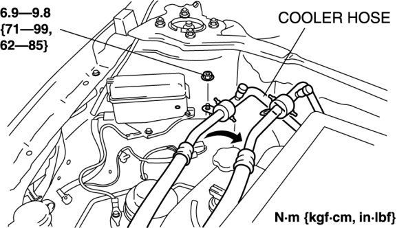 1. Remove the cooler hose bracket nut and set the cooler hose out of the way before performing the generator removal/installation.