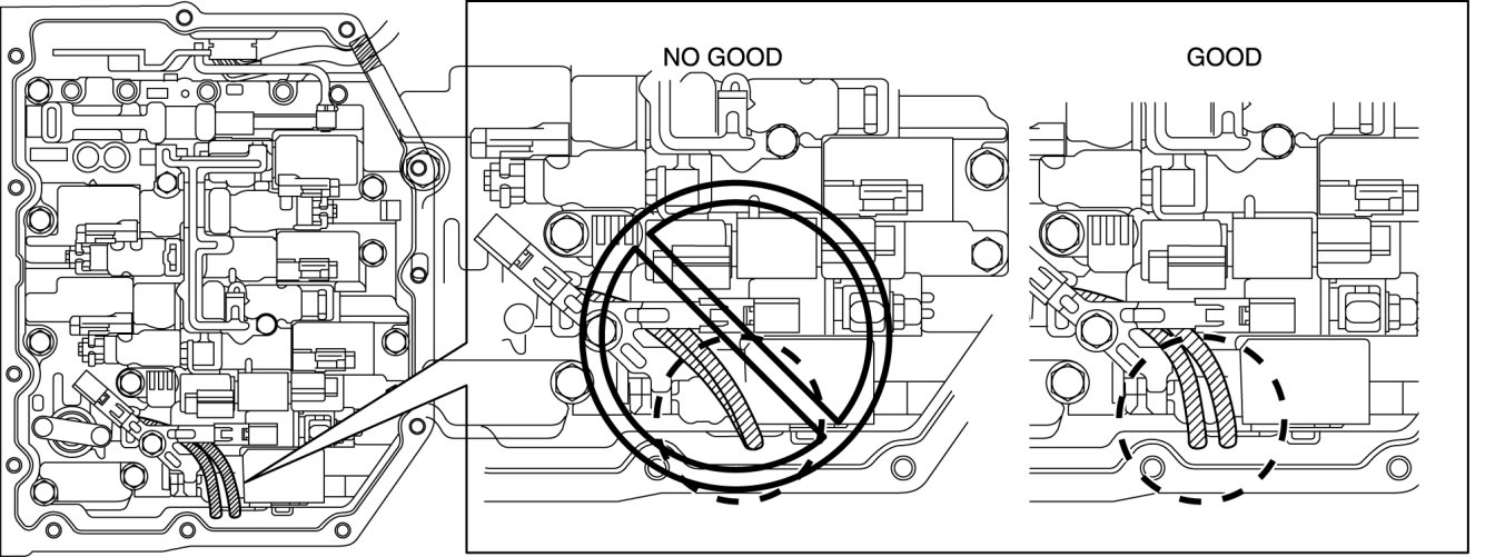 - If the control valve body cover is installed with the wiring harnesses overlapped, the wiring harnesses may be pinched between the cover and valve body causing the wiring harnesses to be damaged. Therefore, verify that the wiring harnesses are not overlapped when installing the control valve body cover.