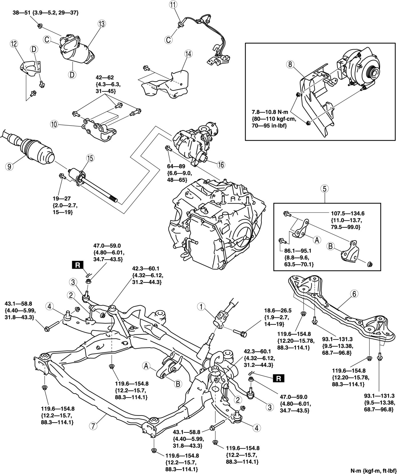 - Bolt C: 42-62 Nm {4.3-6.3kgf-m, 31-45 ft-lbf}