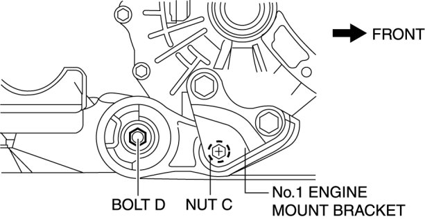 2. Install the No.1 engine mount rubber on the bracket and temporarily tighten bolt C.