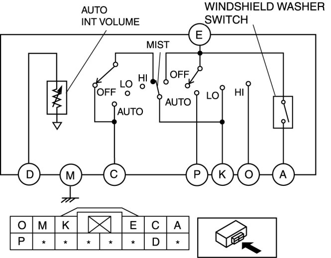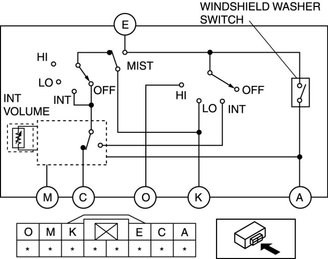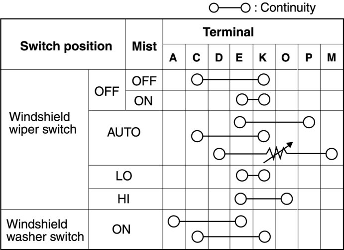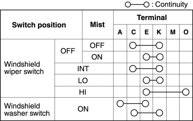 - Verify that the continuity between the windshield wiper and washer switch is as indicated in the table.