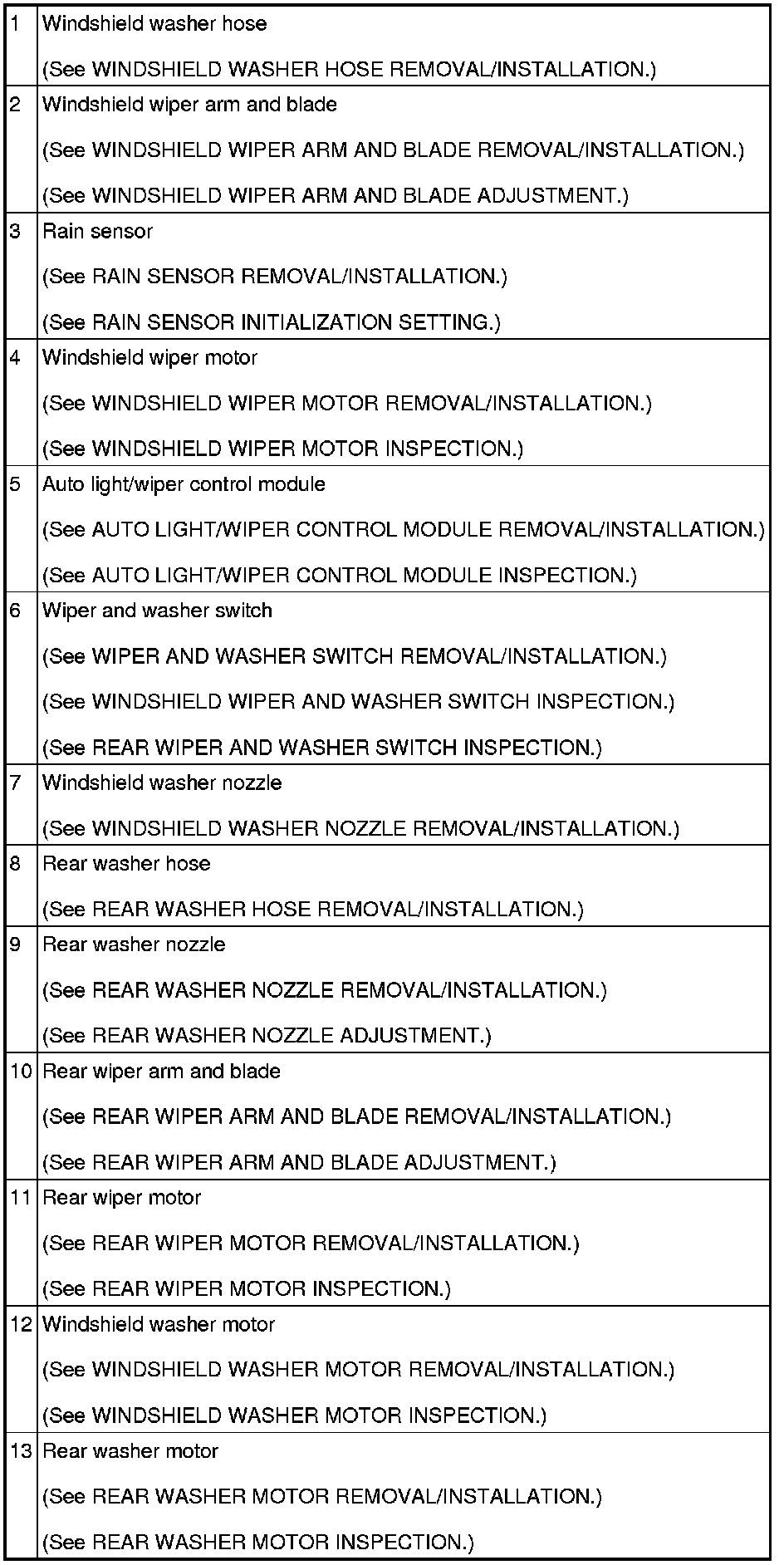 WIPER/WASHER SYSTEM LOCATION INDEX