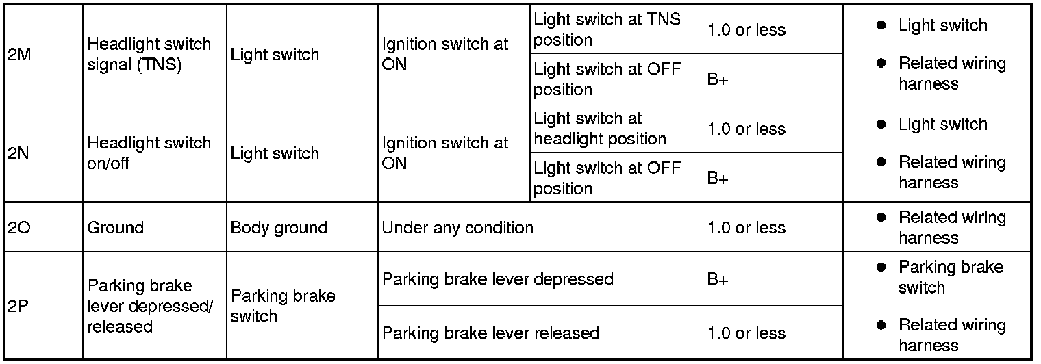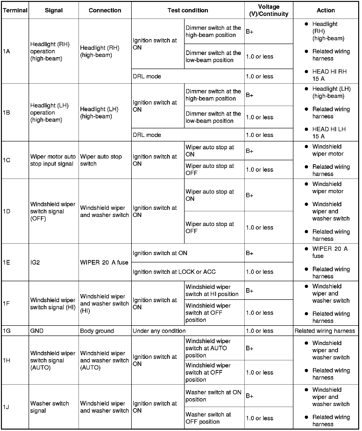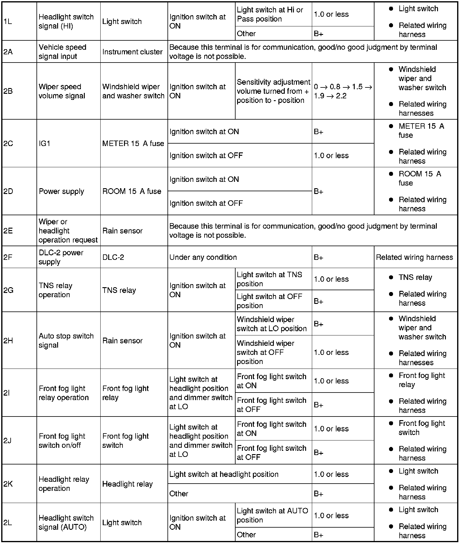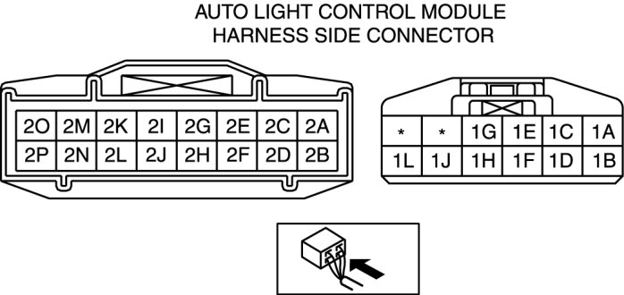 3. Measure the voltage at the auto light/wiper control module terminals as indicated below.