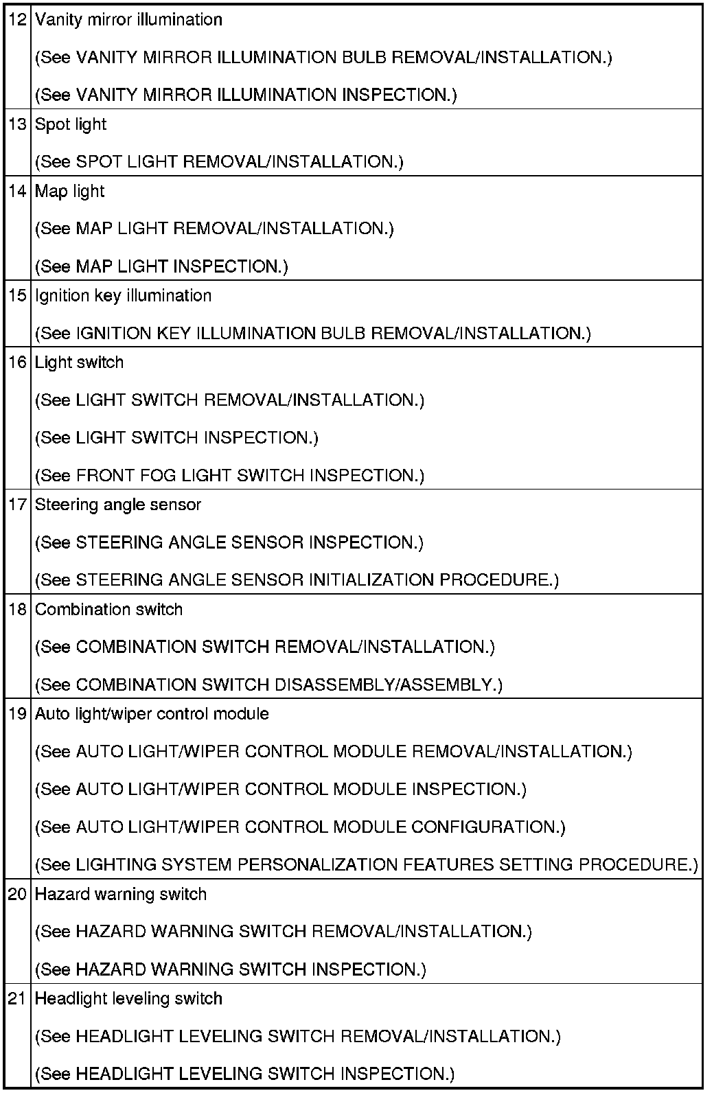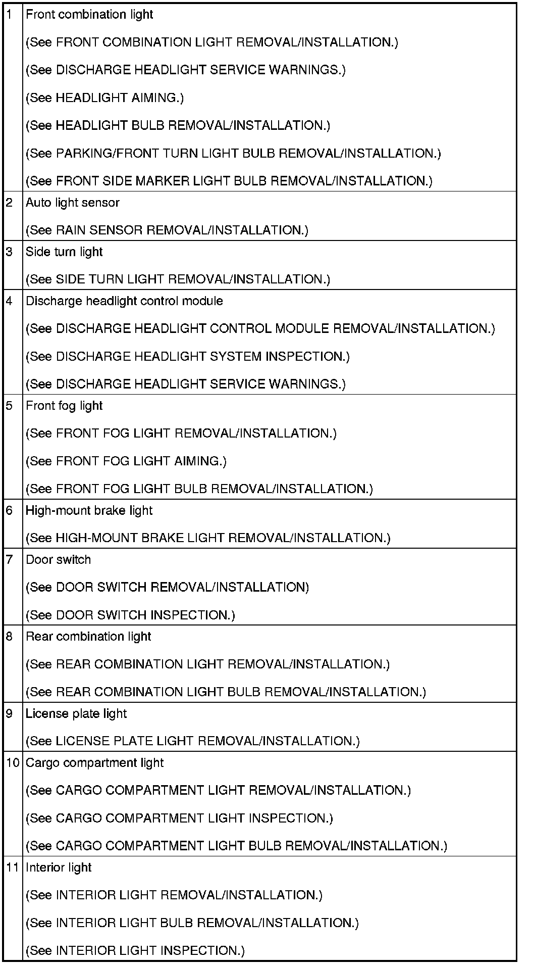 LIGHTING SYSTEMS LOCATION INDEX