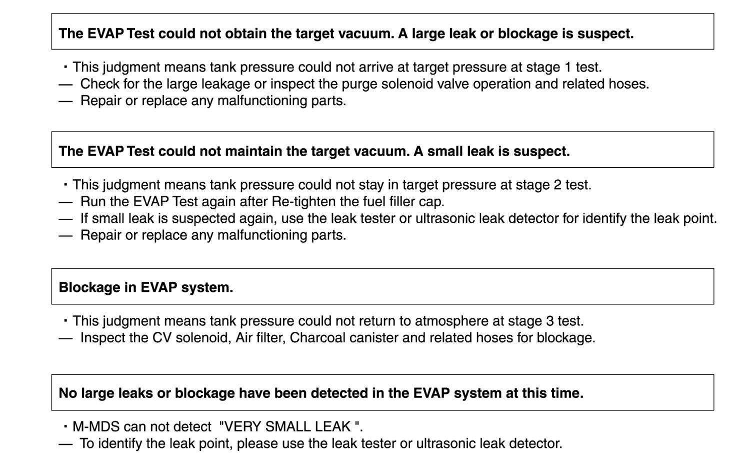 - M-MDS detect the small/large leak or blockage based on fuel tank pressure at the end of EVAP Test.