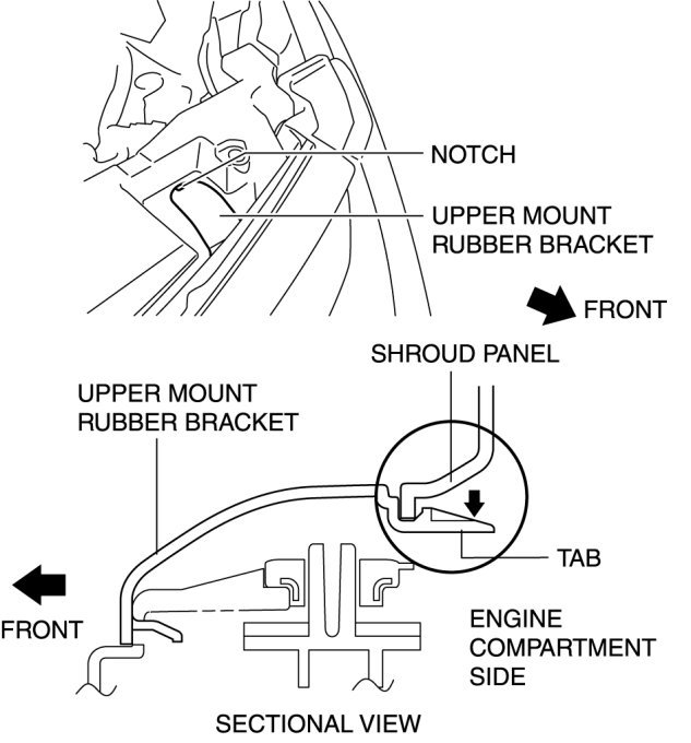 2. While pressing down the upper mount rubber bracket tab lightly in the direction of the arrow shown in the figure, press the upper mount rubber bracket toward the vehicle front.