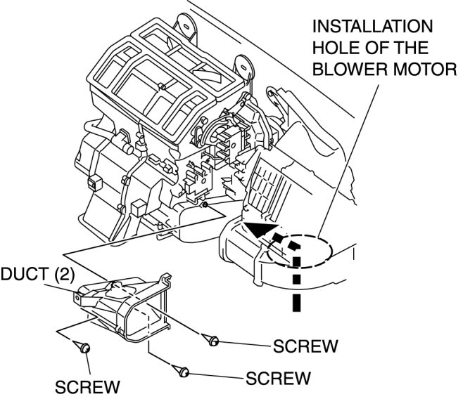 14. Install the duct (2) to the A/C unit by inserting a phillips screwdriver, with the screw, into the hole made after removing the blower motor.