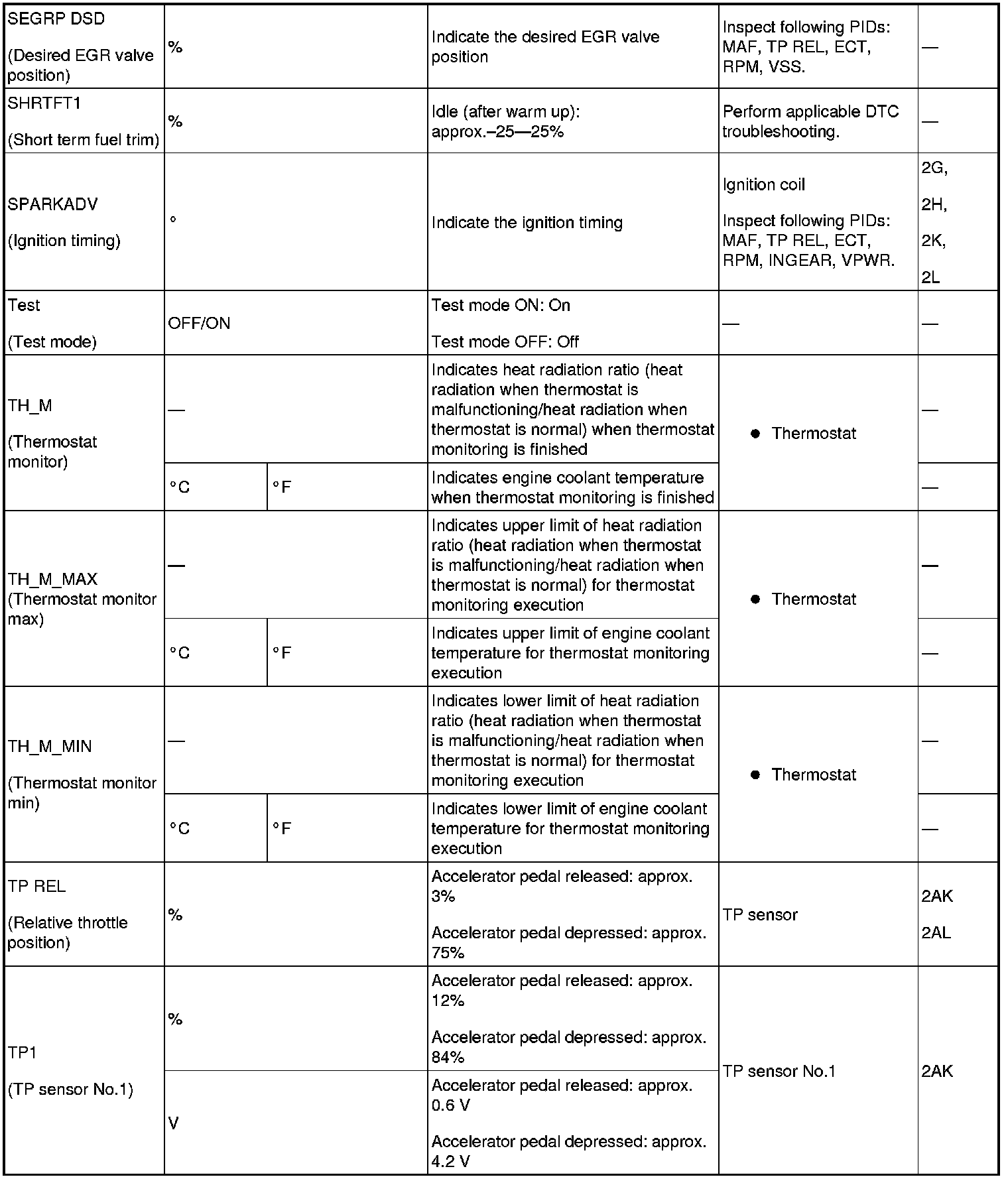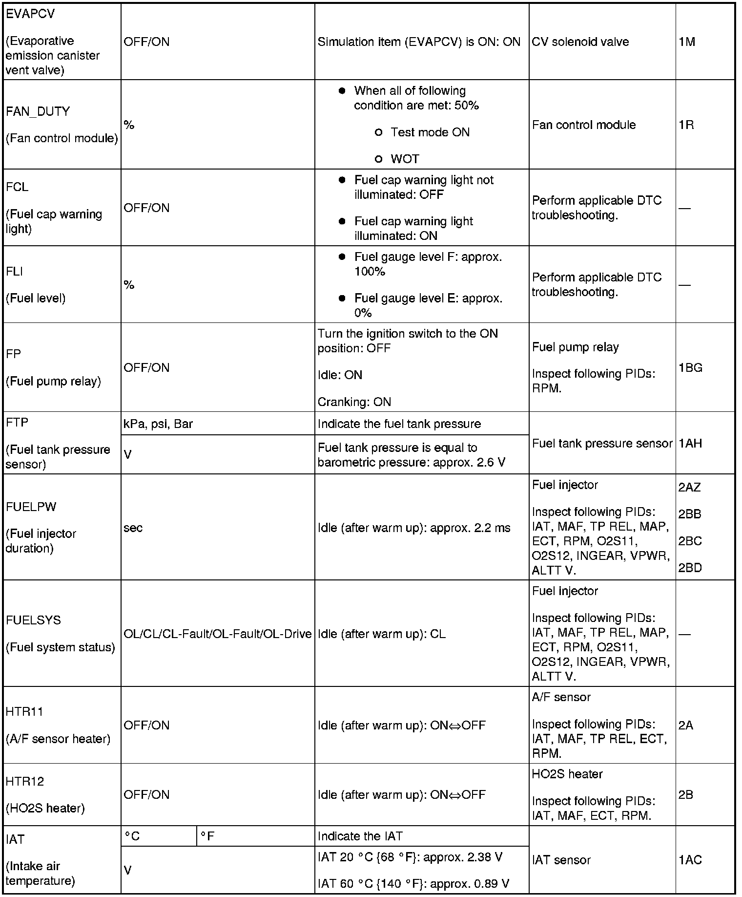 - ACCS, ALTF, ARPMDES, EVAPCP, EVAPCV, FAN_DUTY, FP, IMRC, IMTV, INJ_1~4, SEGRP, TEST, VT Duty1 wt